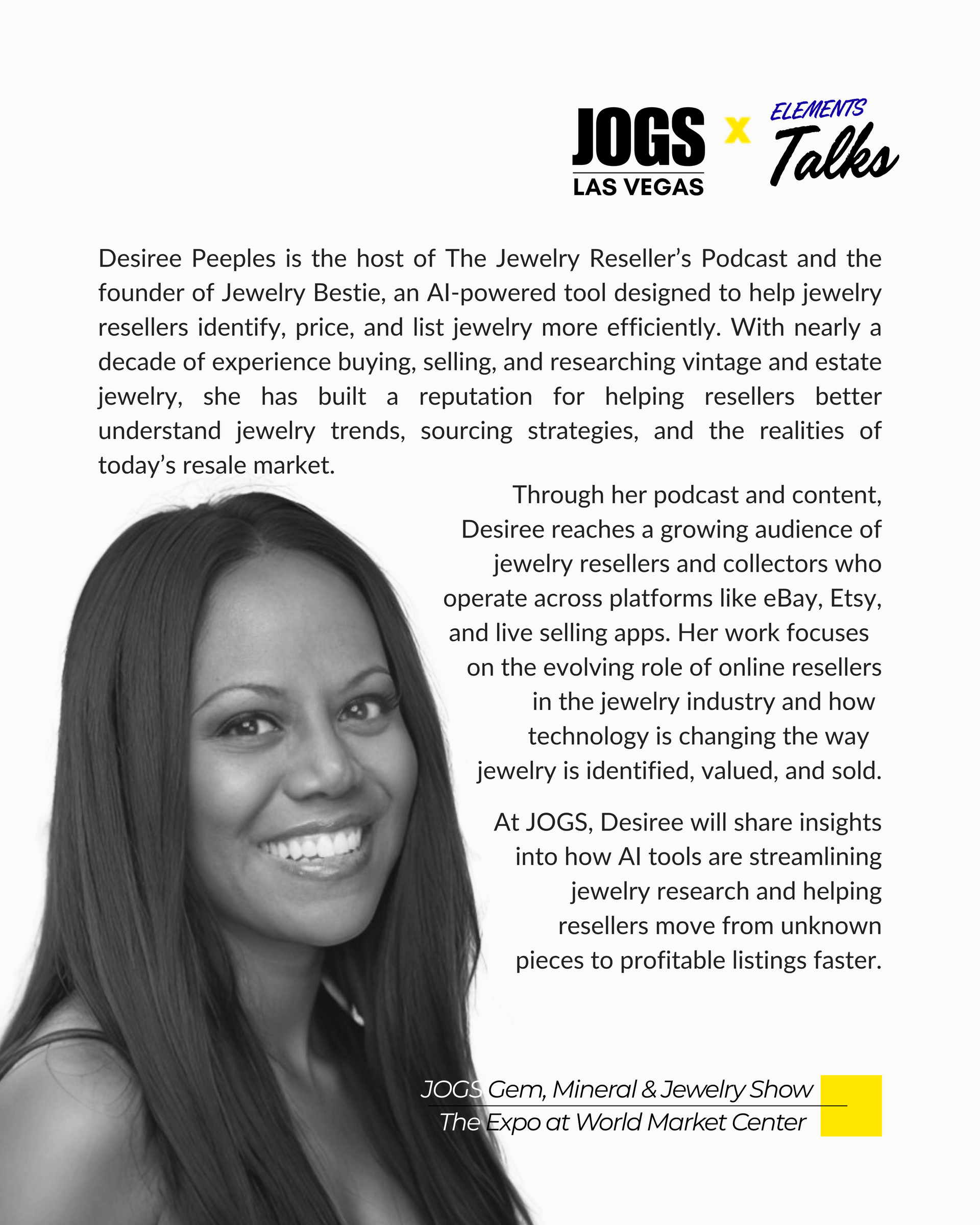 My session, “Technology & Digital Design in Jewelry,” focuses on how AI and digital tools are changing the way jewelry is identified, priced, and brought to market.