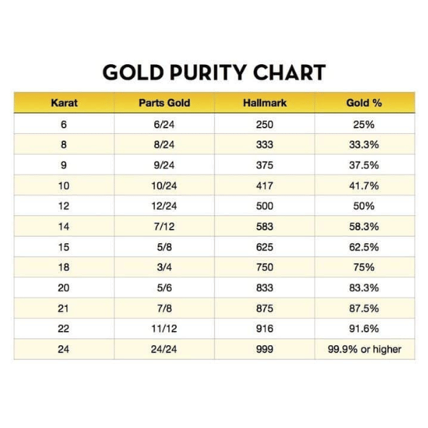 Here’s a breakdown of the most common gold purity levels in jewelry: